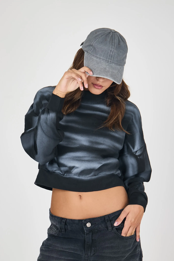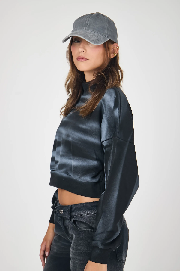 Buzo de tela rustico, sin capucha. Es de algodón. Es corto y oversize. Estampado.