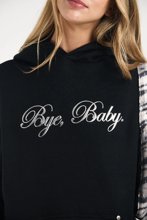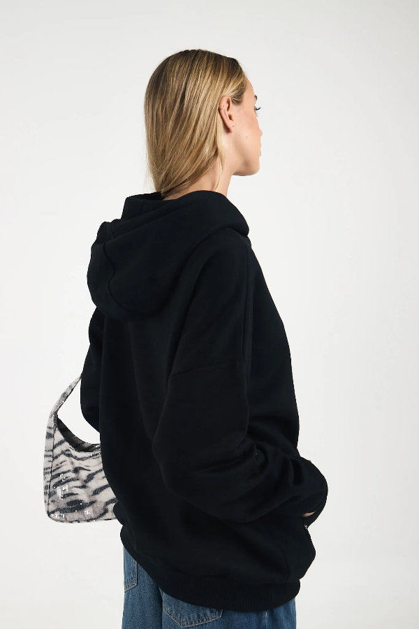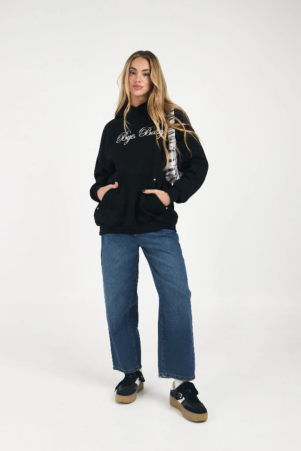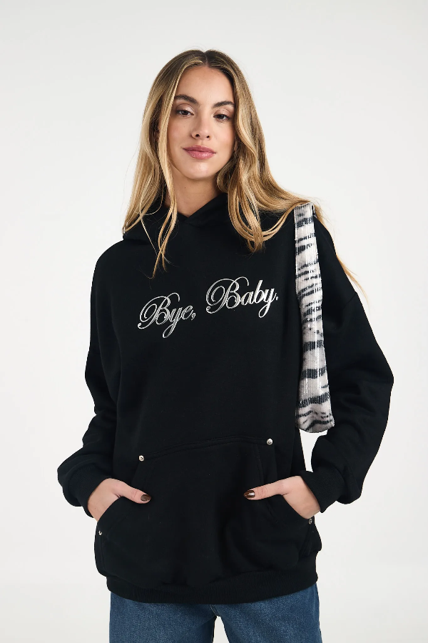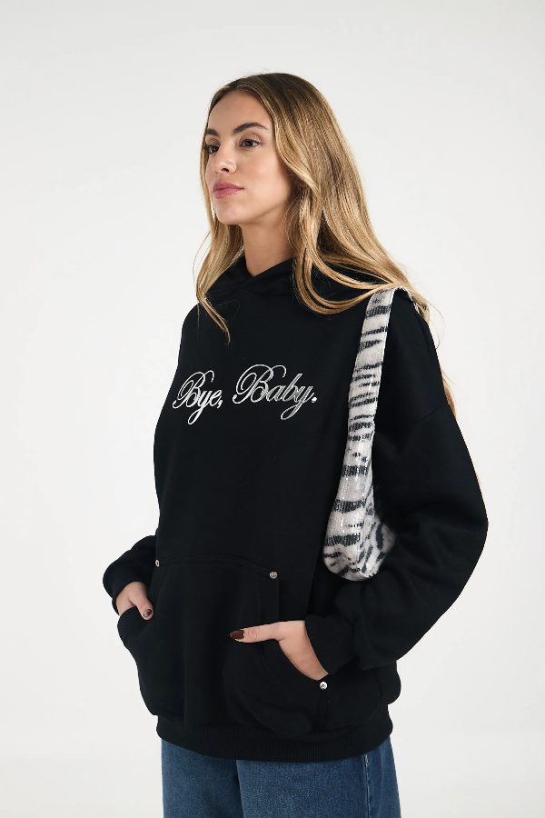 Buzo hoodie, con capucha y bolsillo. Es oversize, la tela interior es de frisa y por fuera algodón. Tiene una estampa de aplique en la parte delantera.