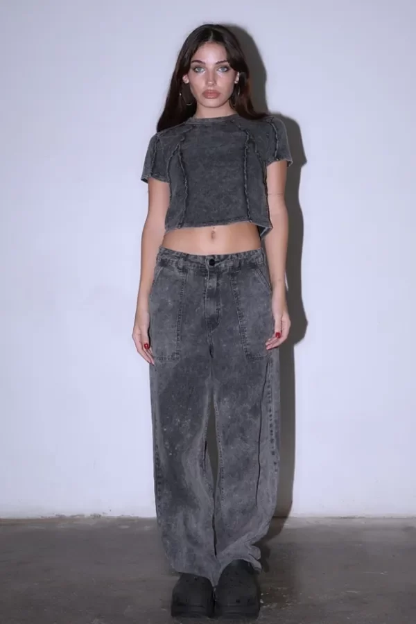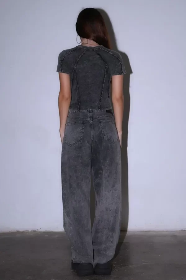 Remera de algodón ribb, un poco flexible y al cuerpo. Tiene un lavado que hace que se vea desgastada.