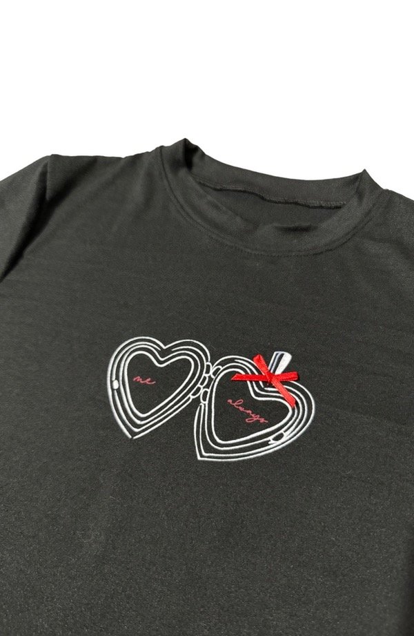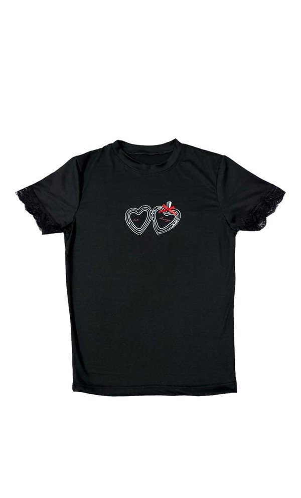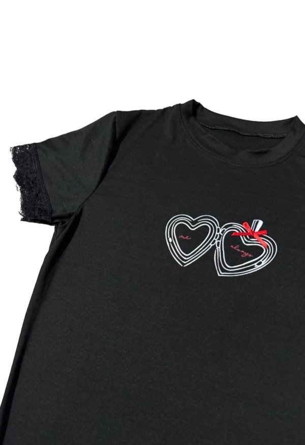 Remera de tela modal soft, 95% poliester y 5% lycra. Es elastizada y al cuerpo, no es pesada ya que la tela es fina. Tiene puntilla en las mangas, está estampada y tiene cosido un moñito rojo.