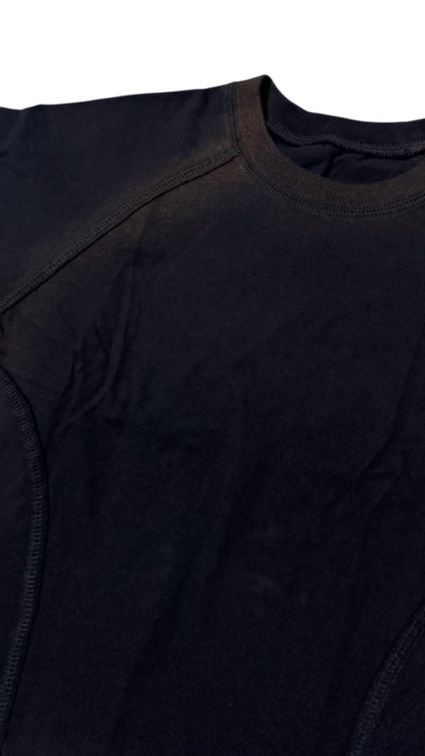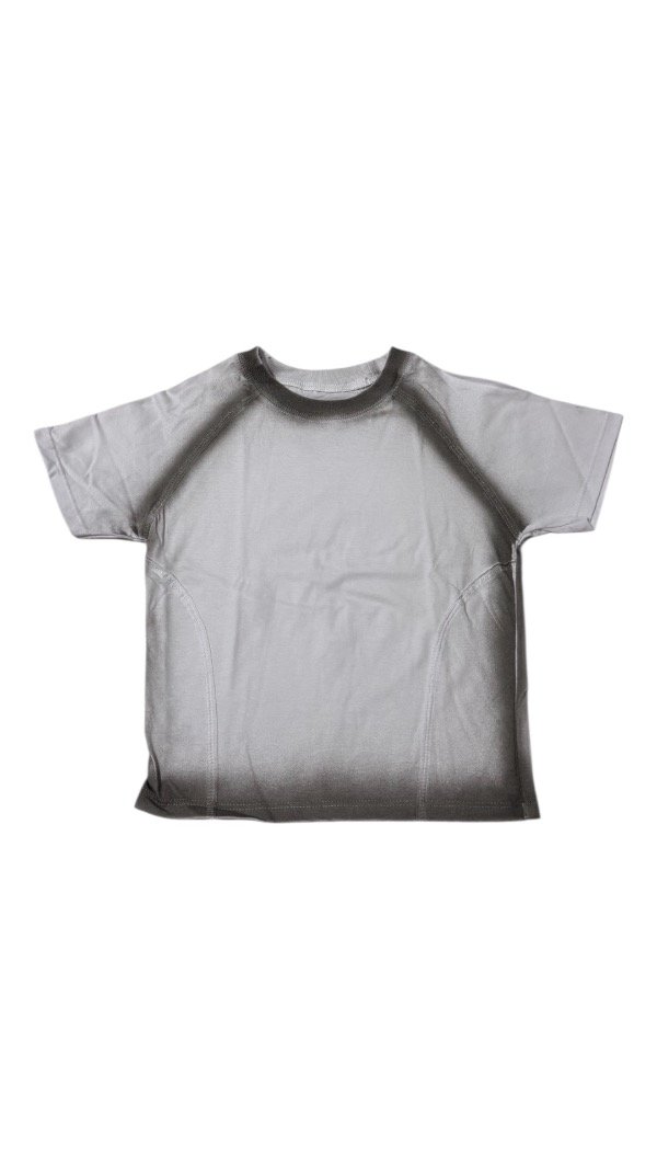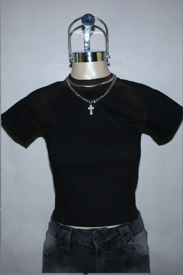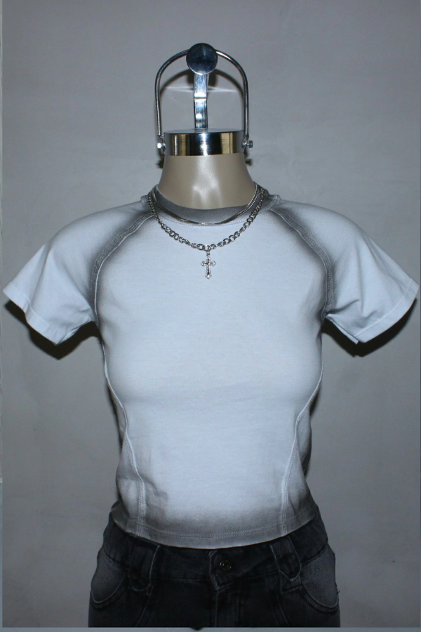 Remera baby tee lisa, la tela es algodón ribb, es al cuerpo y flexible. Tiene un efecto de gastado en las uniones y también tiene costuras inversas.