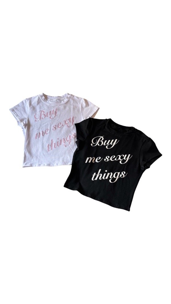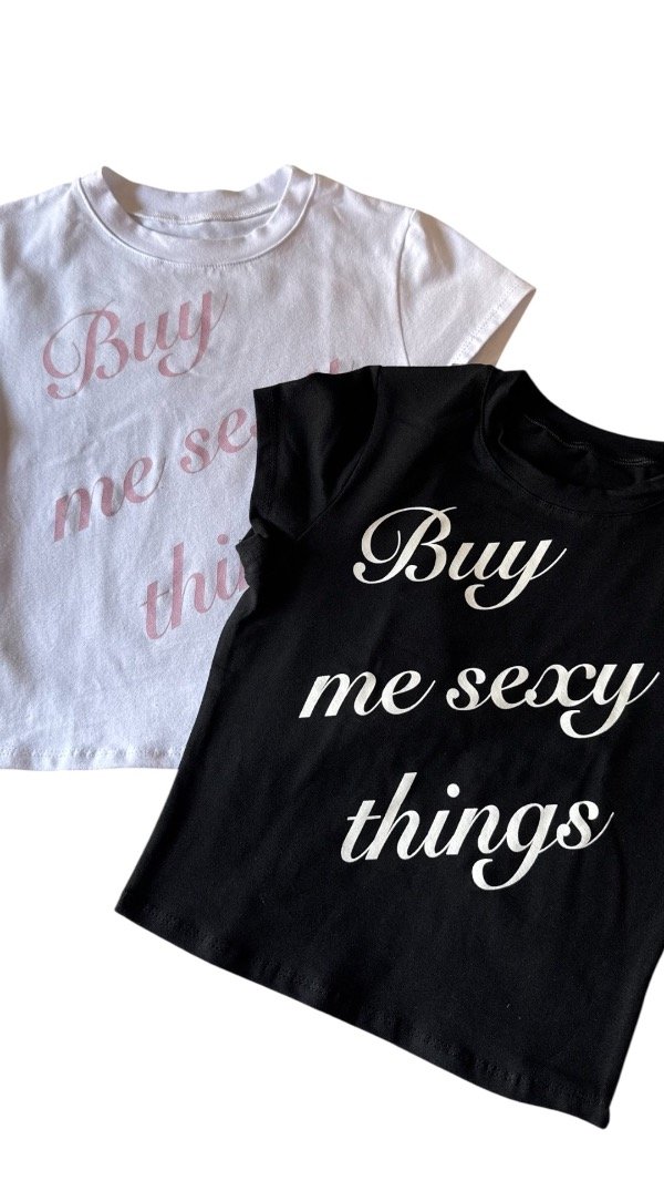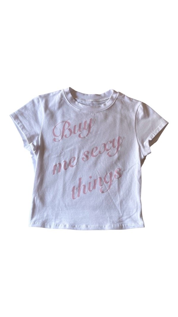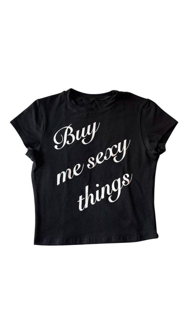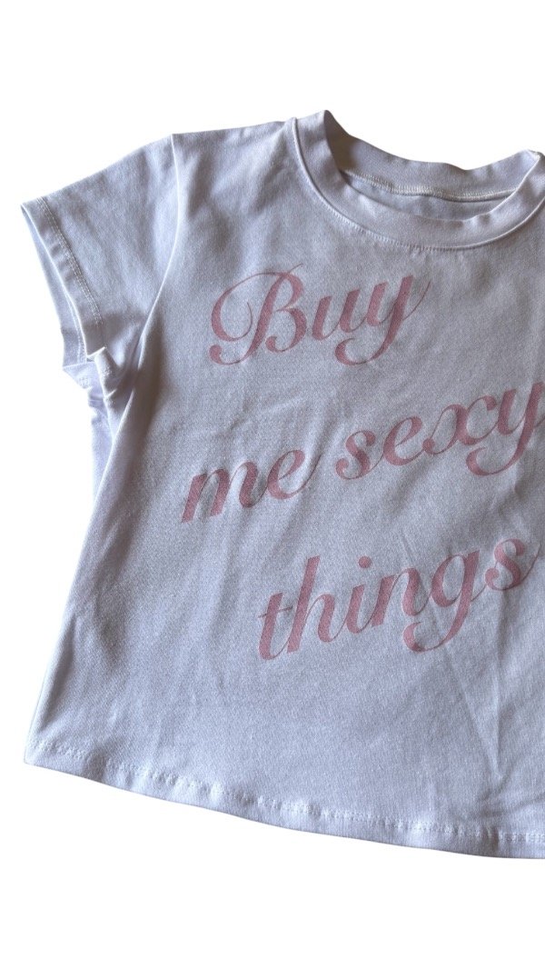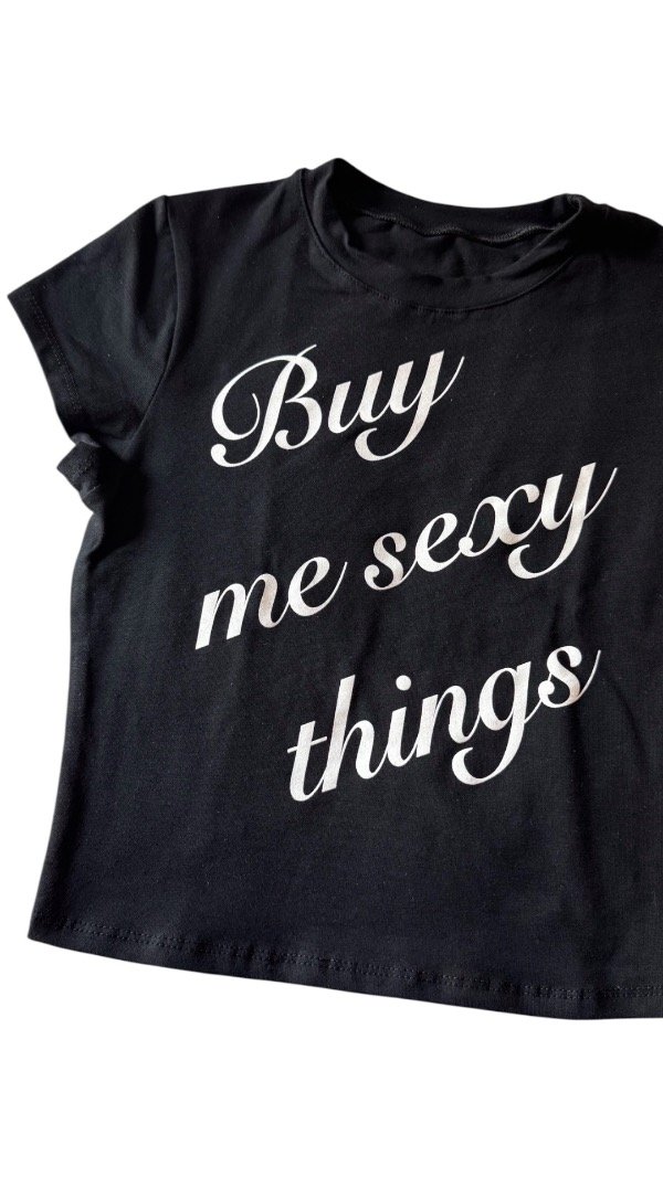 Remera baby tee, estampada, la tela es algodón con lycra, por lo que es al cuerpo. Es flexible.