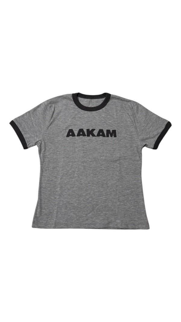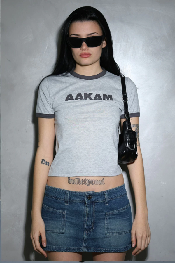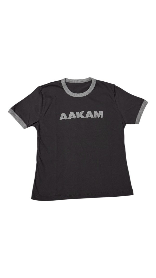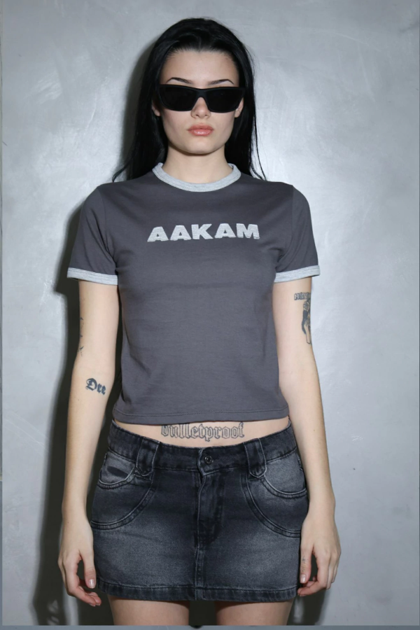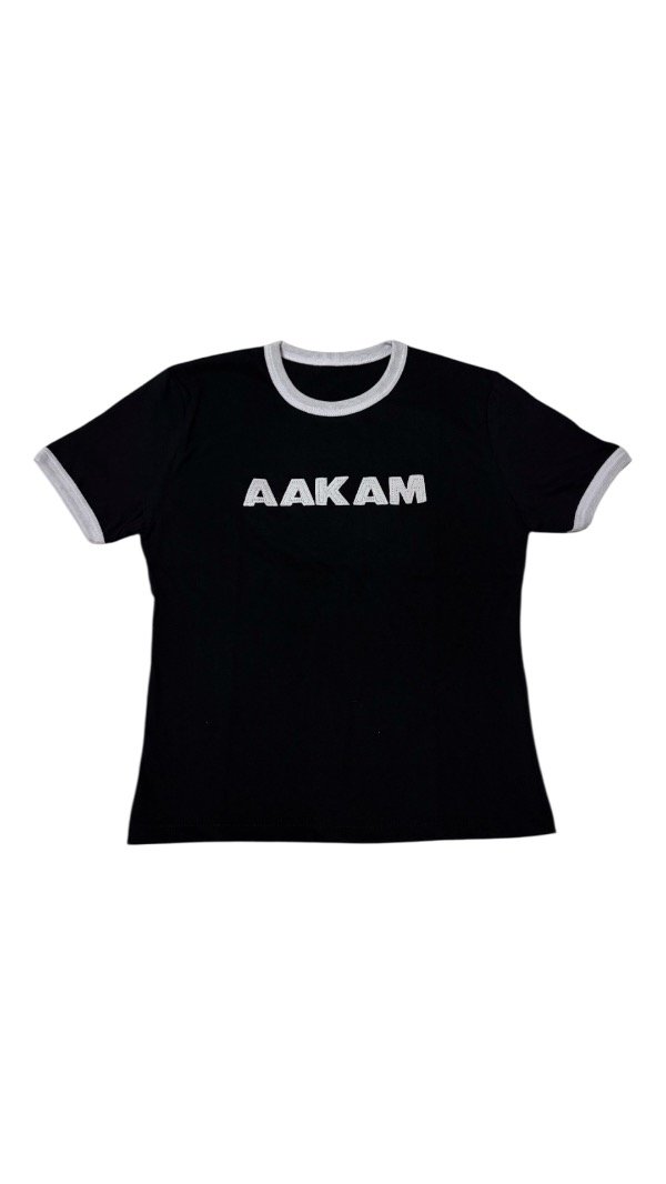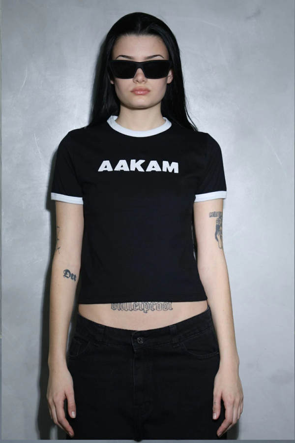 Remera baby tee, estampada, la tela es algodón ribb, es al cuerpo y flexible. Tiene bordada una estampa delantera “AAKAM”