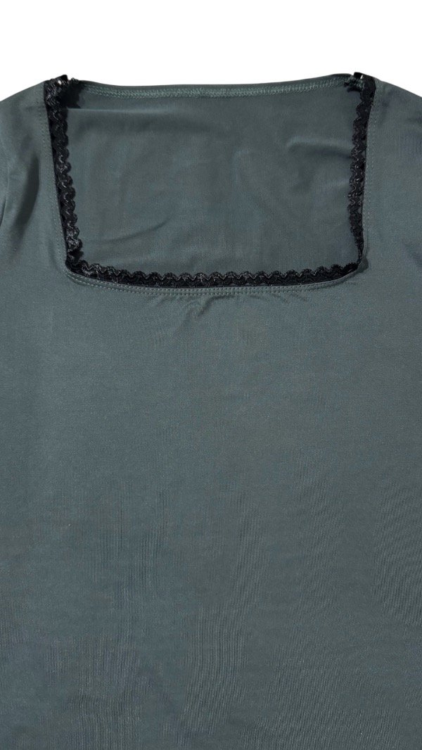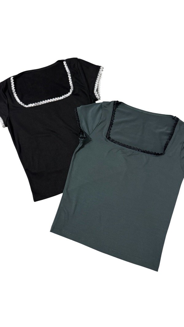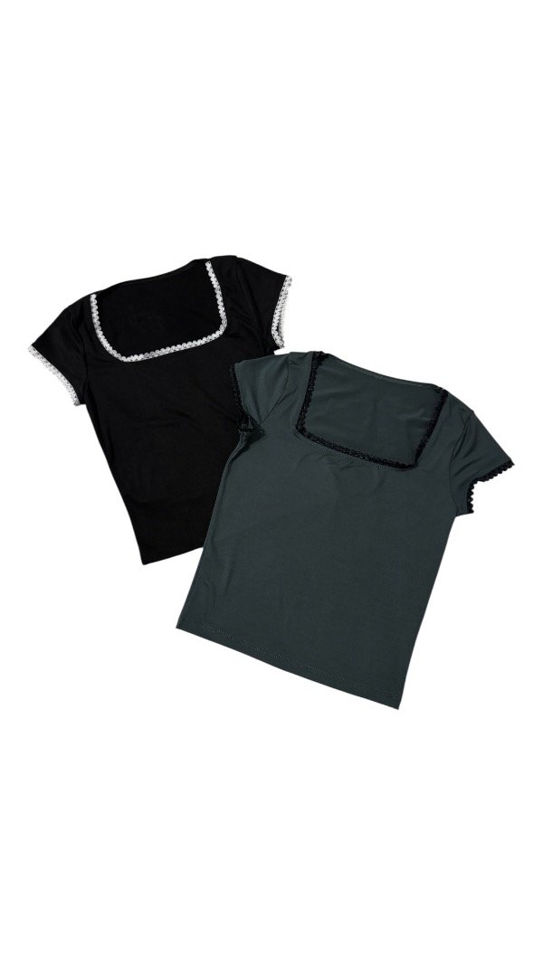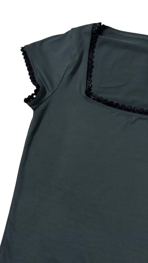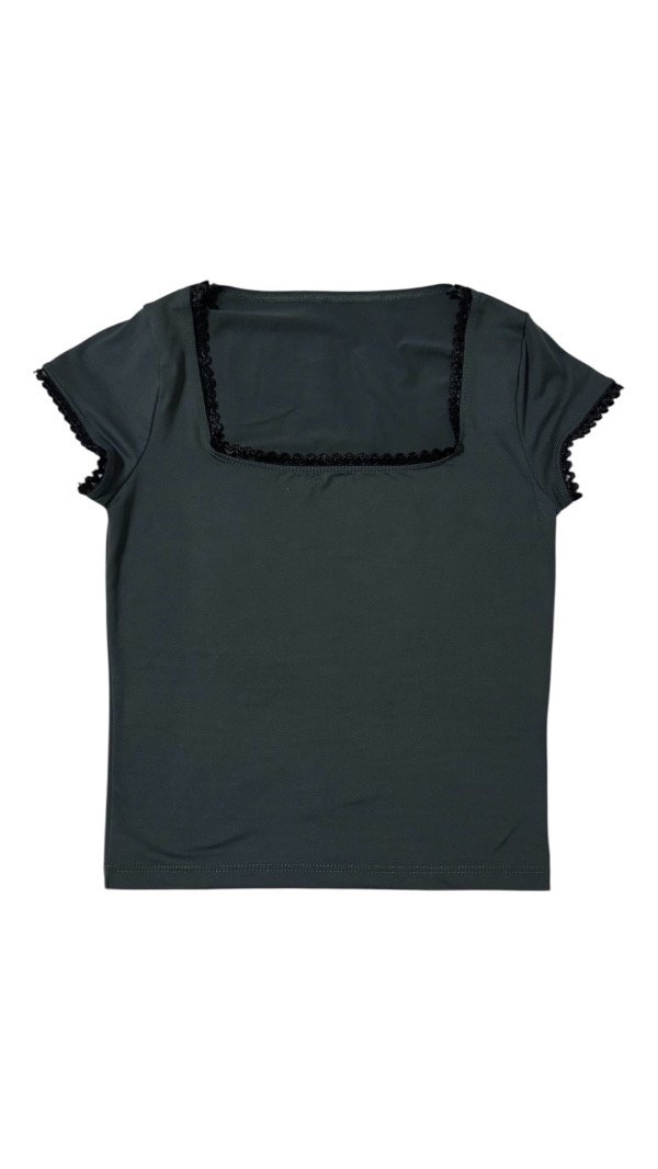 Remera crop de tela estilo soft brush, con escote cuadrado y puntilla en el cuello y mangas. Es flexible y al cuerpo.