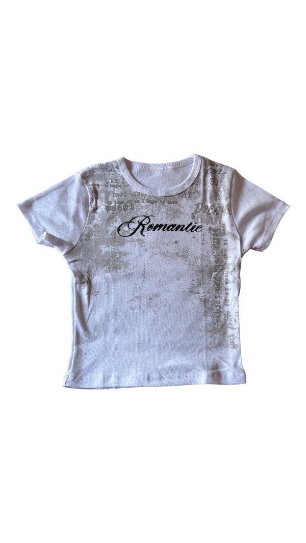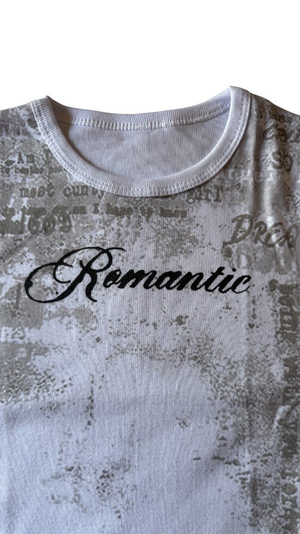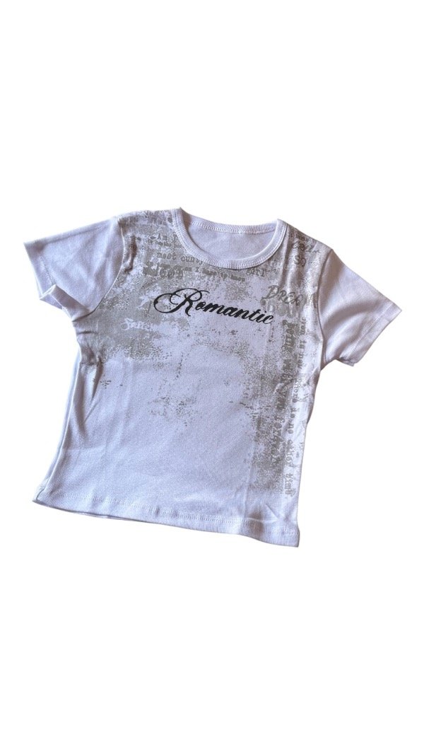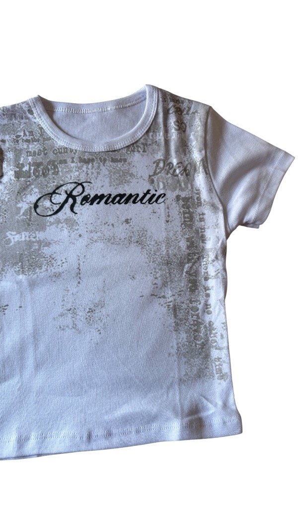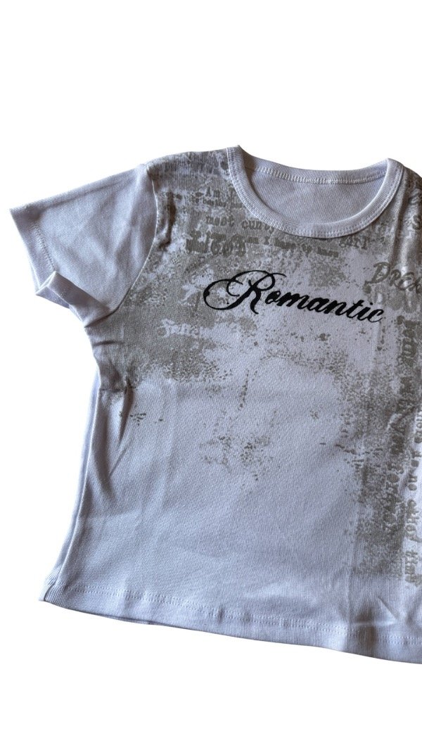 Remera baby tee, estampada, la tela es algodón con lycra, por lo que es al cuerpo. Es flexible. Tiene escote en V.
