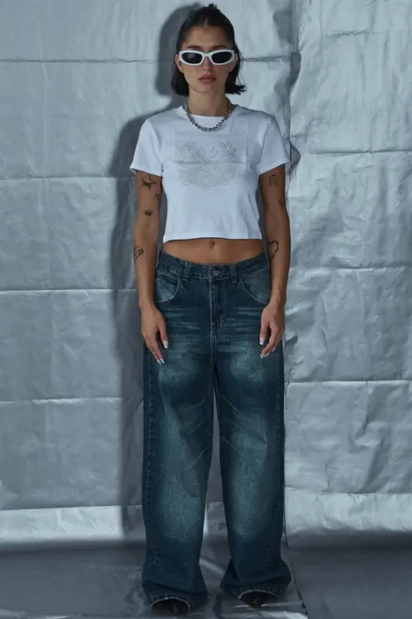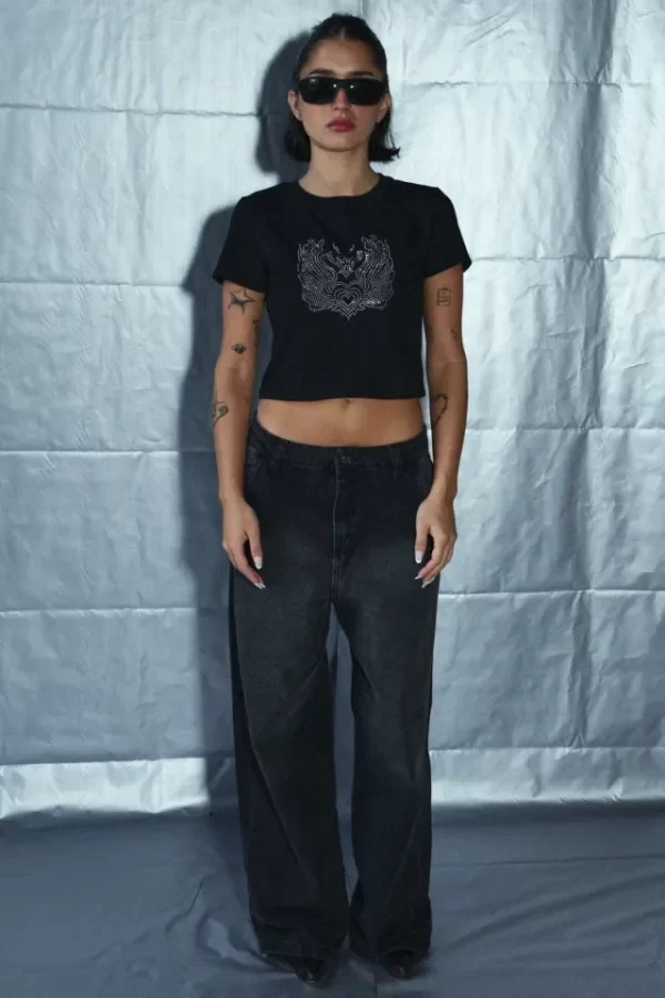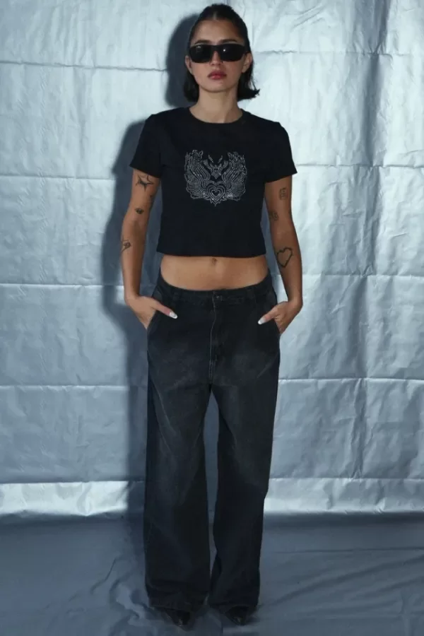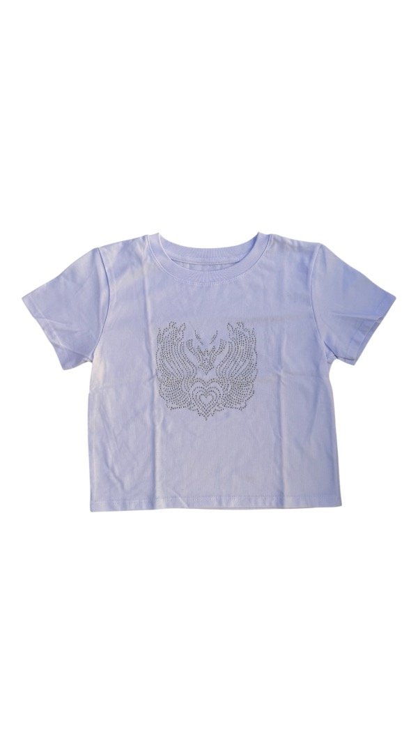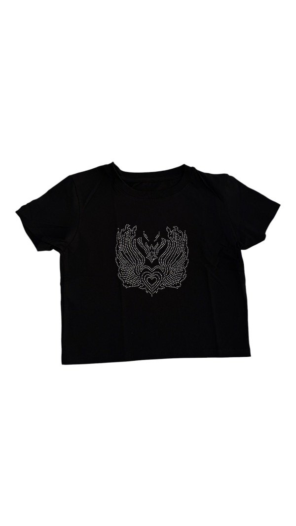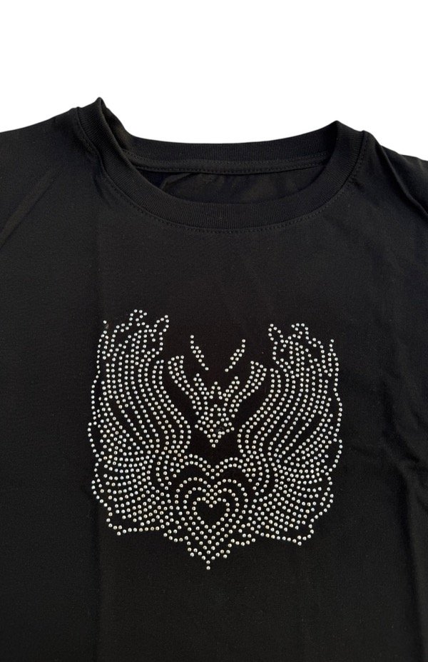 Remera de tela algodón jersey, estampada por delante con strass. Es flexible y un poco suelta.