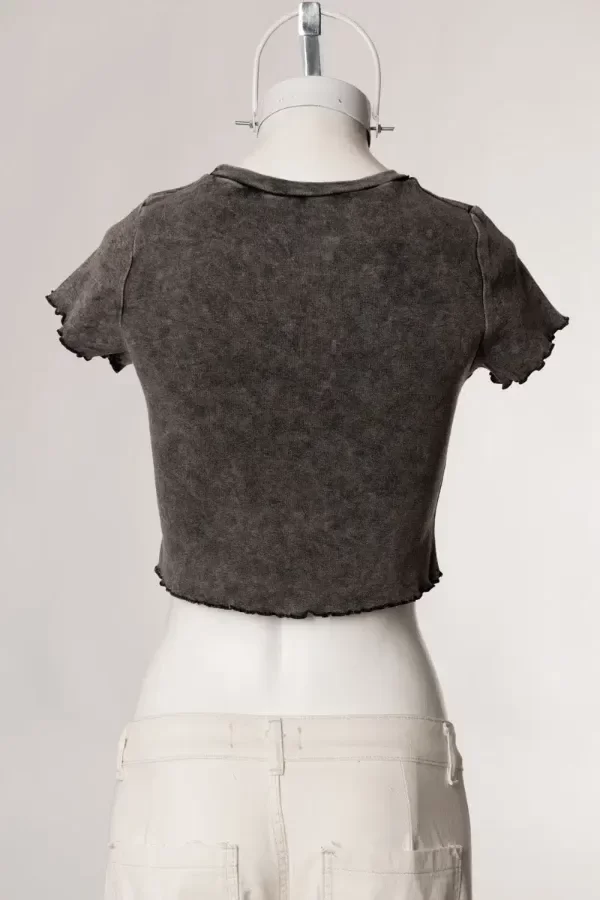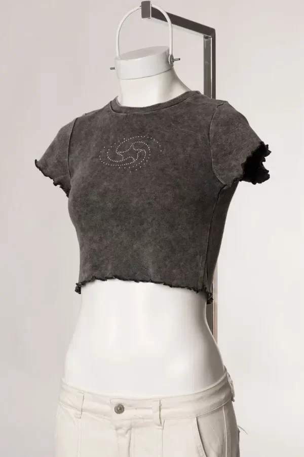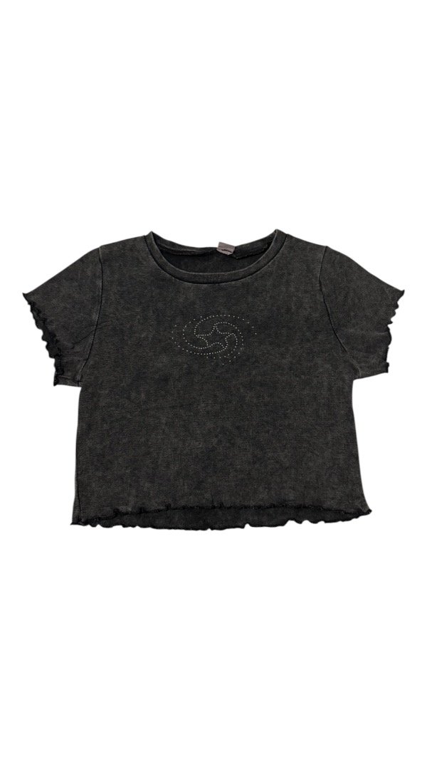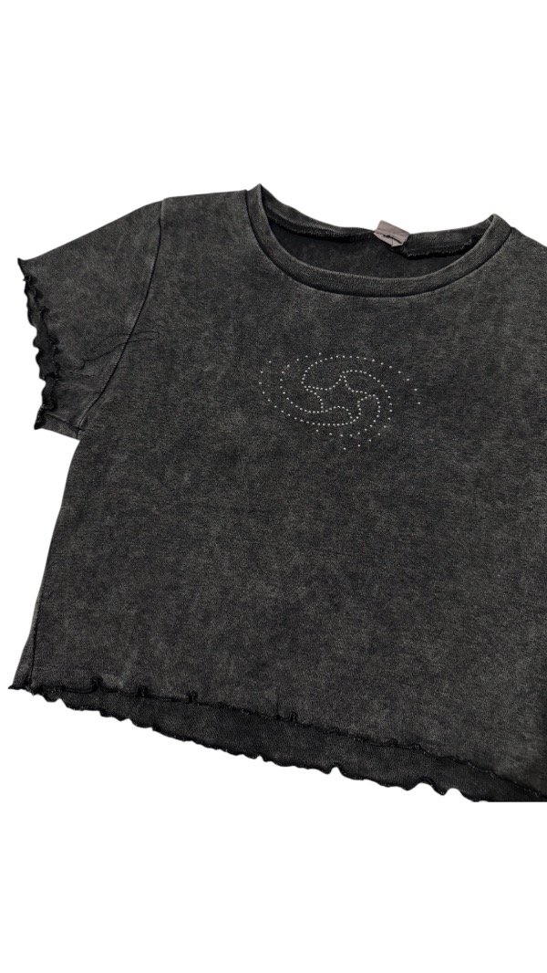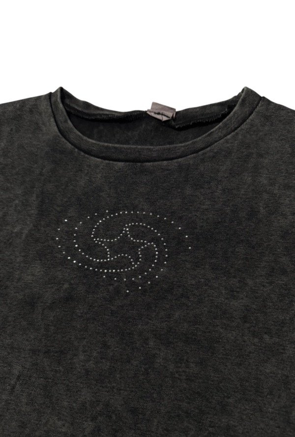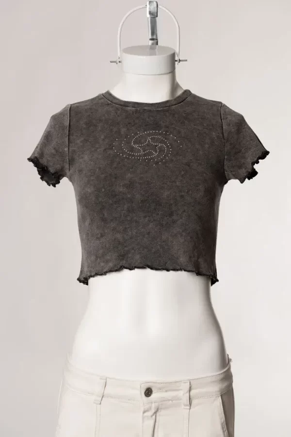 Remera de tela algodón ribb, tiene un lavado que hace que la tela tenga un estilo desgastado "dirty wash". Tiene cuello redondo, y estampa delantera con strass. Es flexible y al cuerpo.