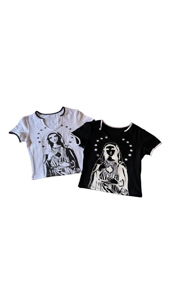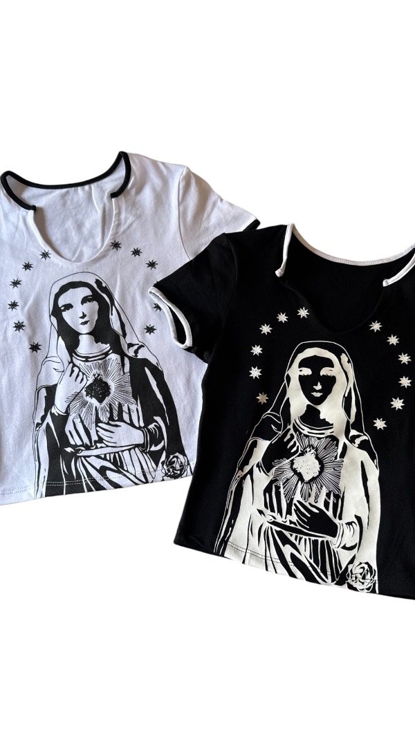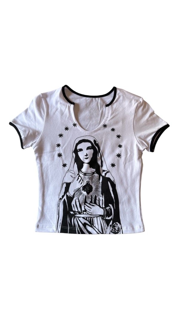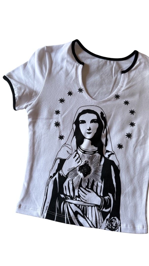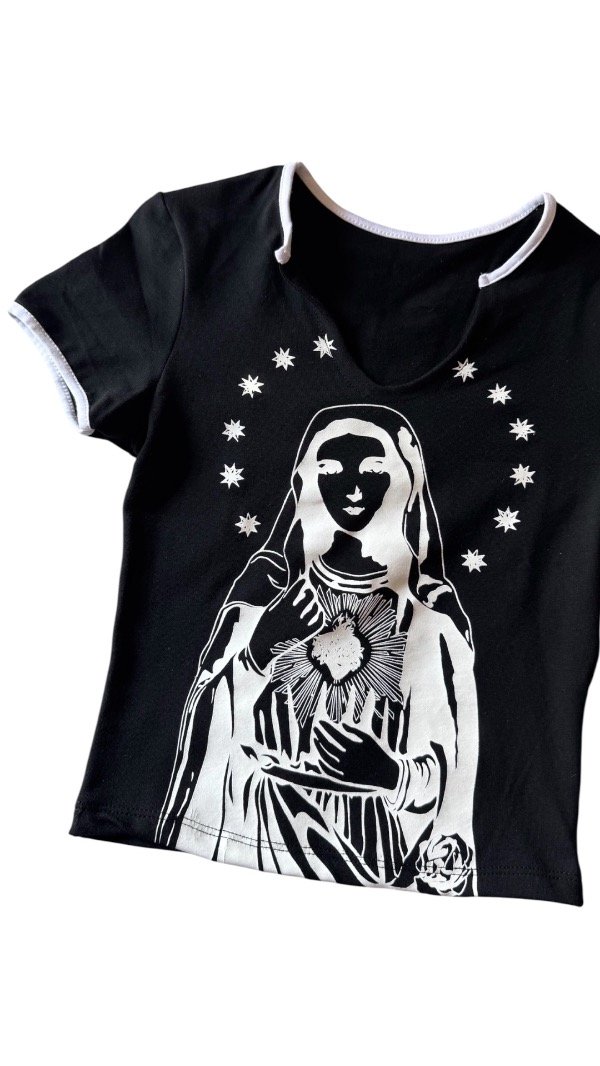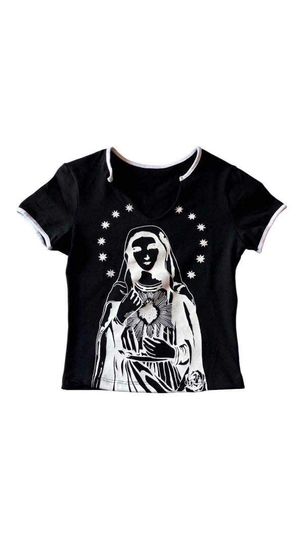 Remera baby tee, estampada, la tela es algodón con lycra, por lo que es al cuerpo. Es flexible. Tiene escote en V.