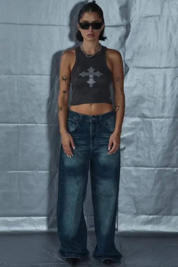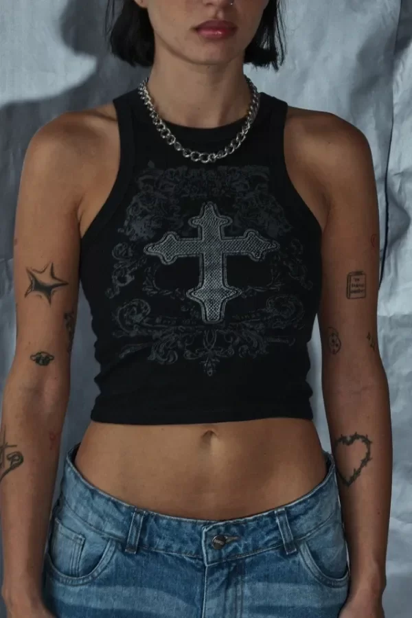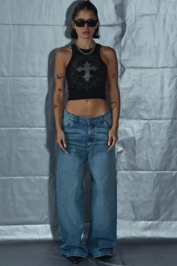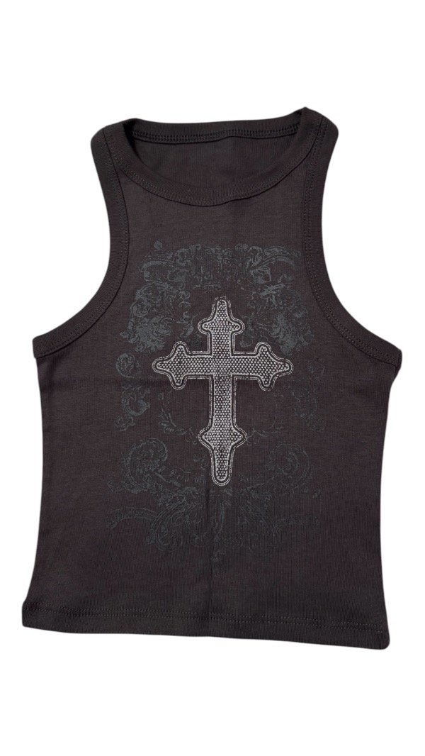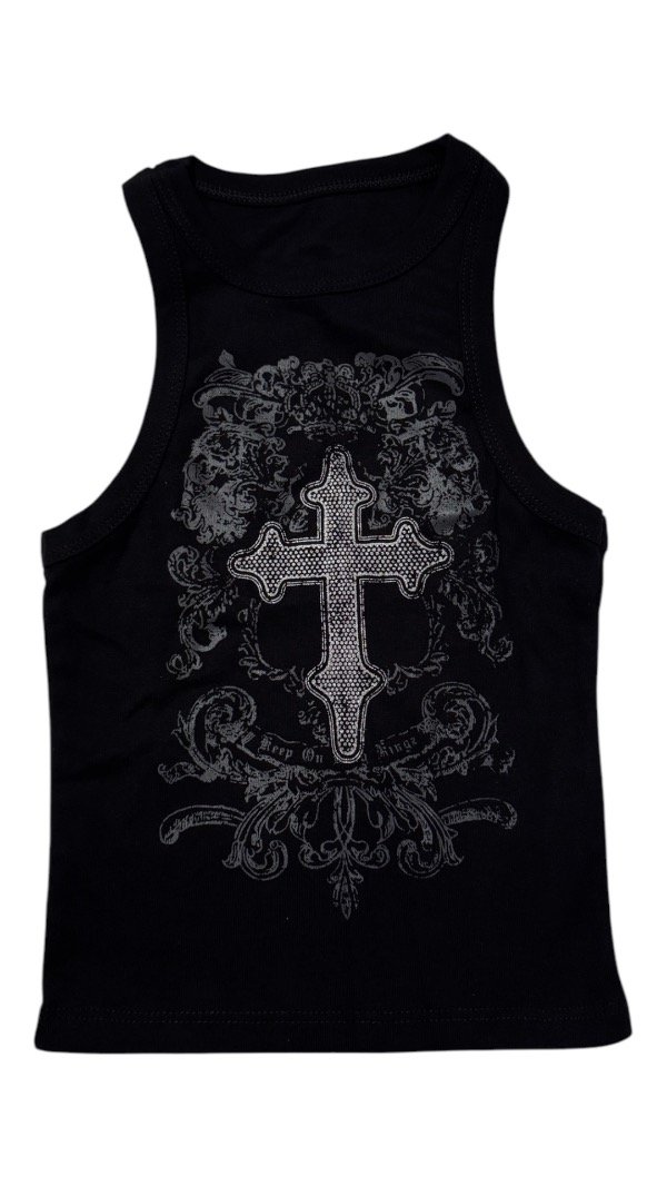 Musculosa, de tela algodón ribb, estampada por delante y con unas pequeñas perlas . Es al cuerpo, estira poco por lo que lo recomendamos para un talle XS, de lo contrario quedaría muy apretada.